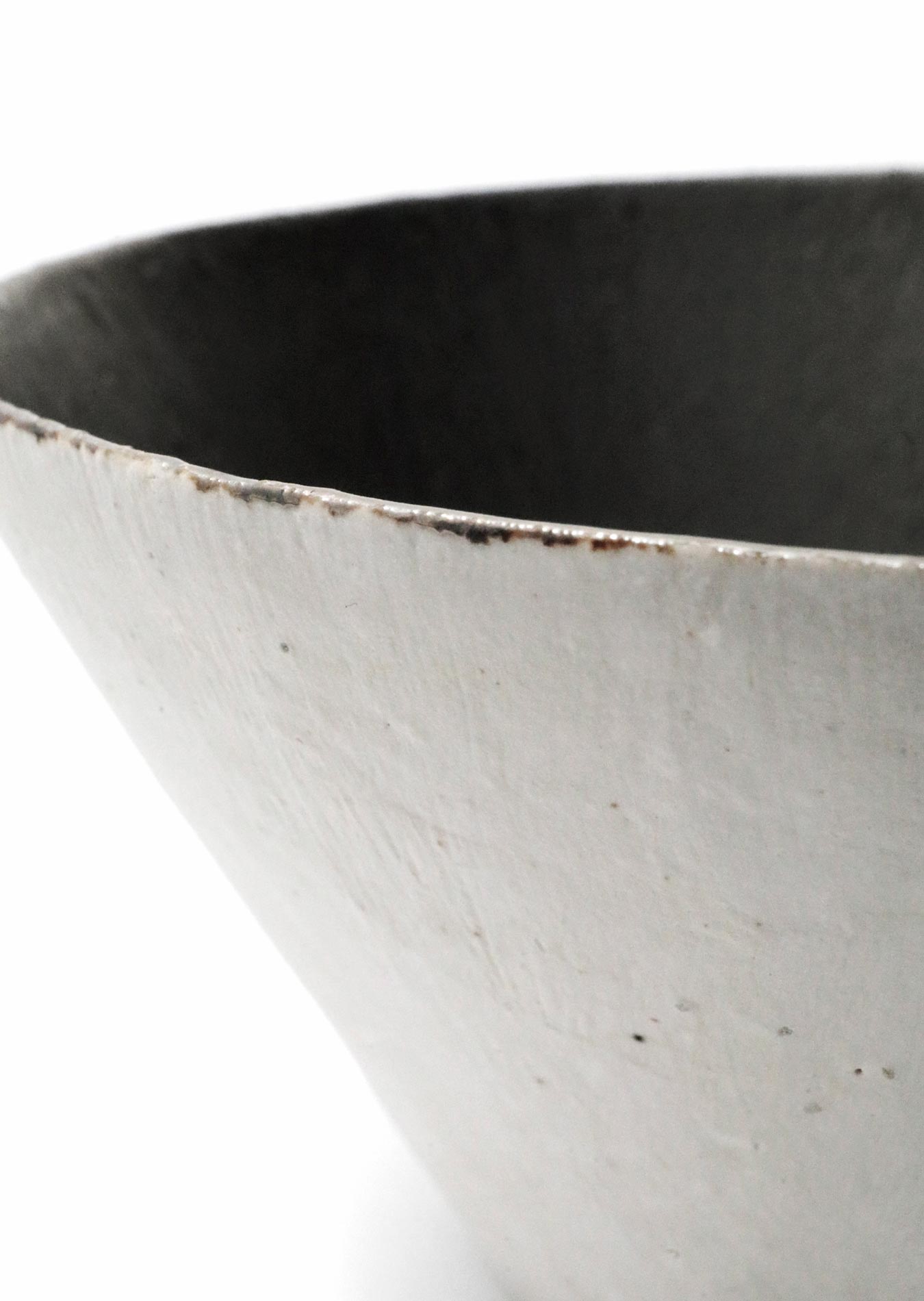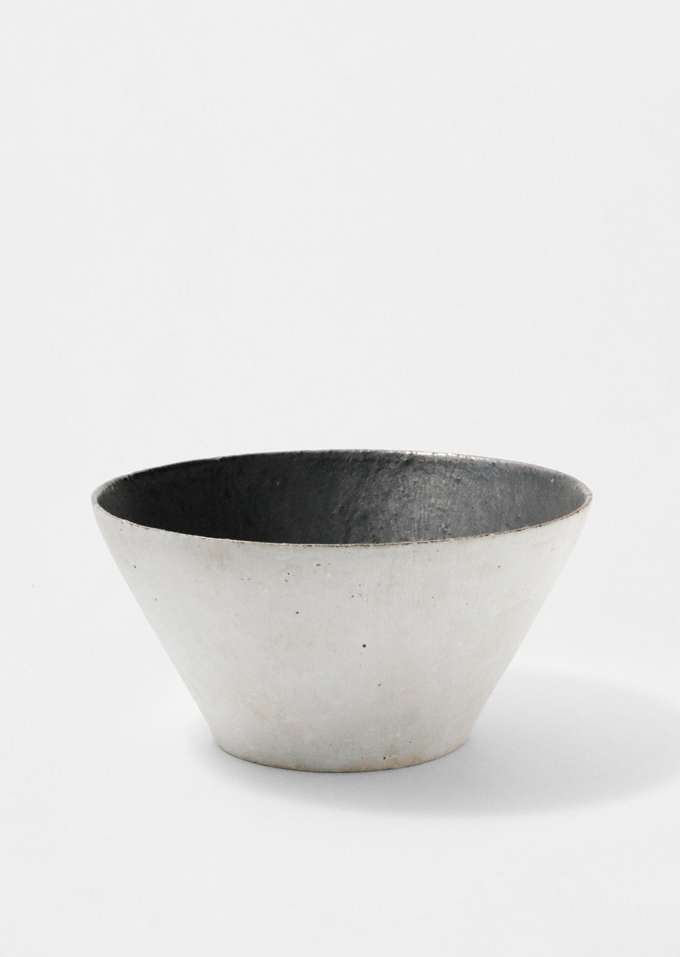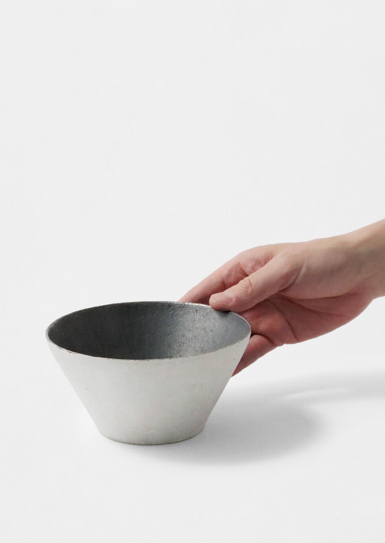 内側に金属感のあるセミマットな黒色に所々銅色模様が覗くどら鉢。外のザラッとした手触りのマットな白と、シンプルで直線的なフォルム、全体のコントラストも美しい器です。