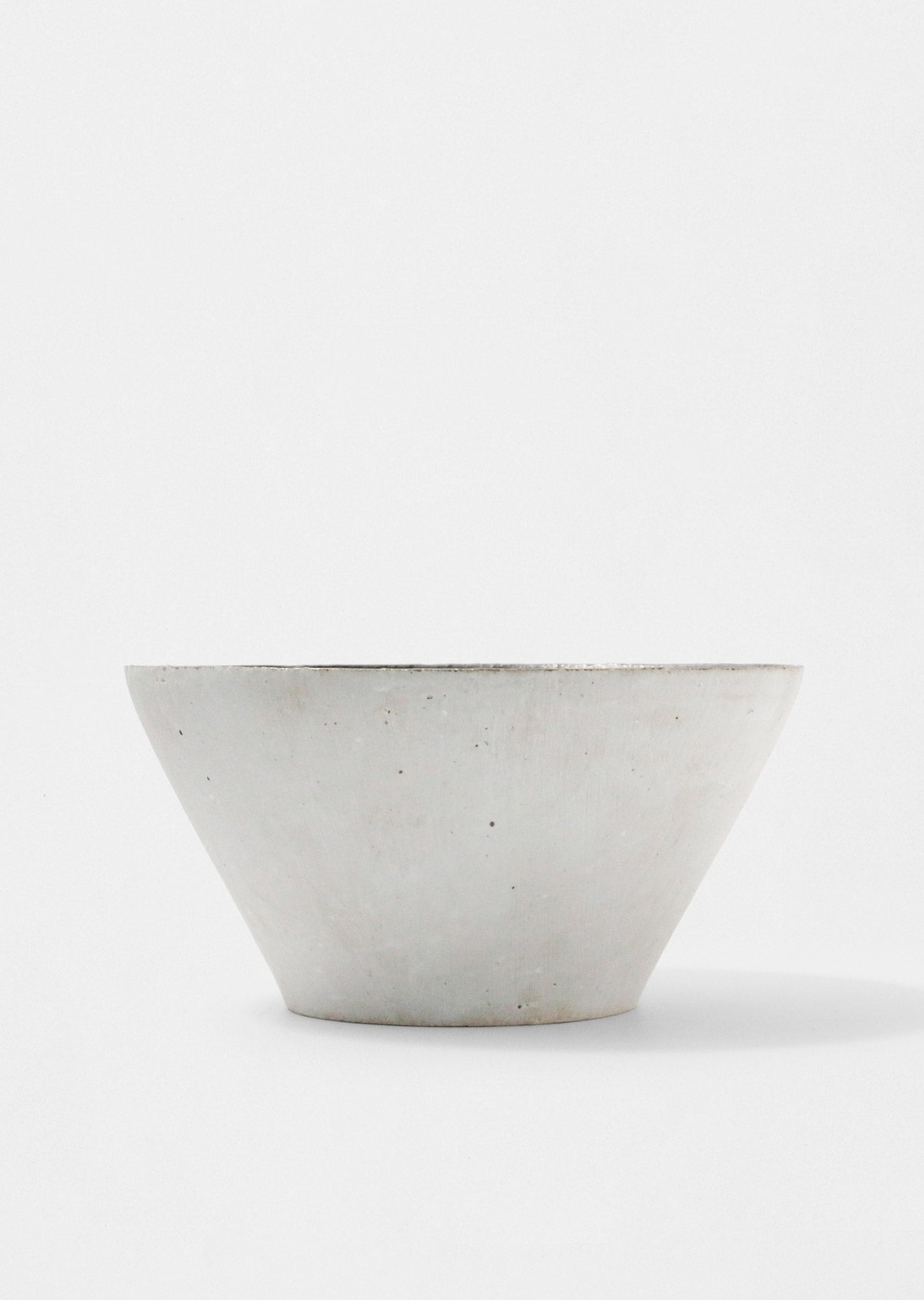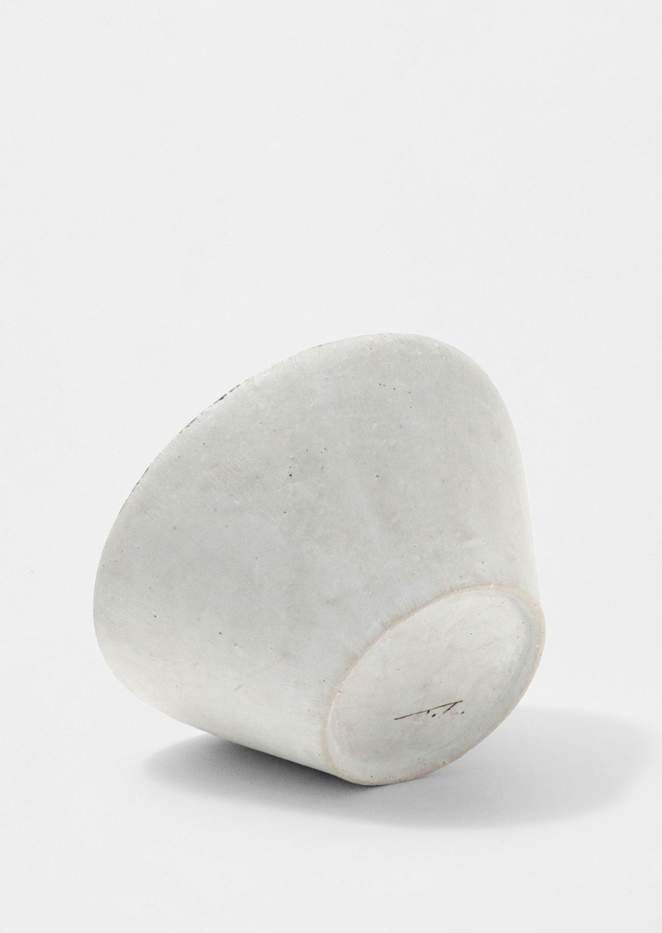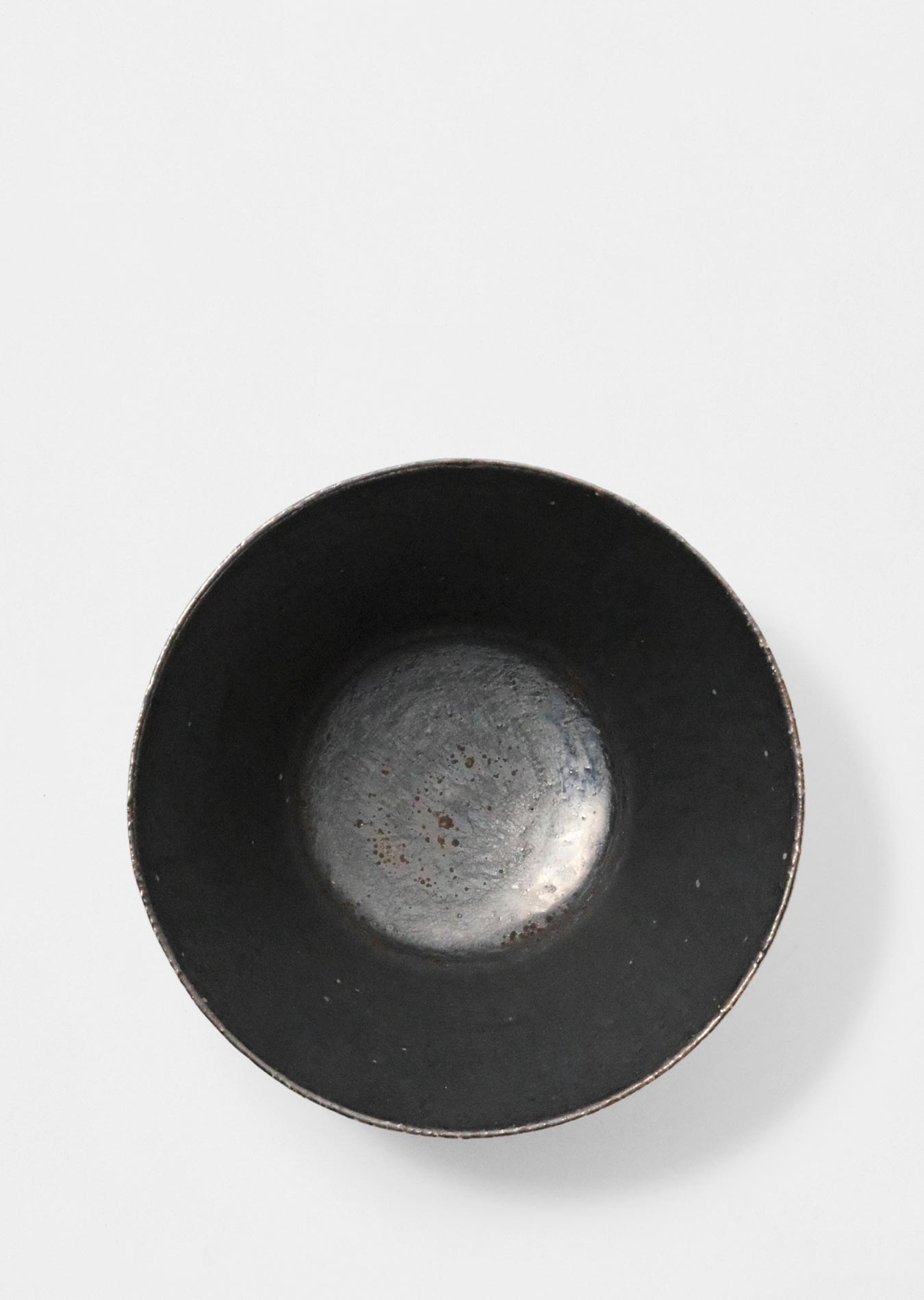 内側に金属感のあるセミマットな黒色に所々銅色模様が覗くどら鉢。外のザラッとした手触りのマットな白と、シンプルで直線的なフォルム、全体のコントラストも美しい器です。