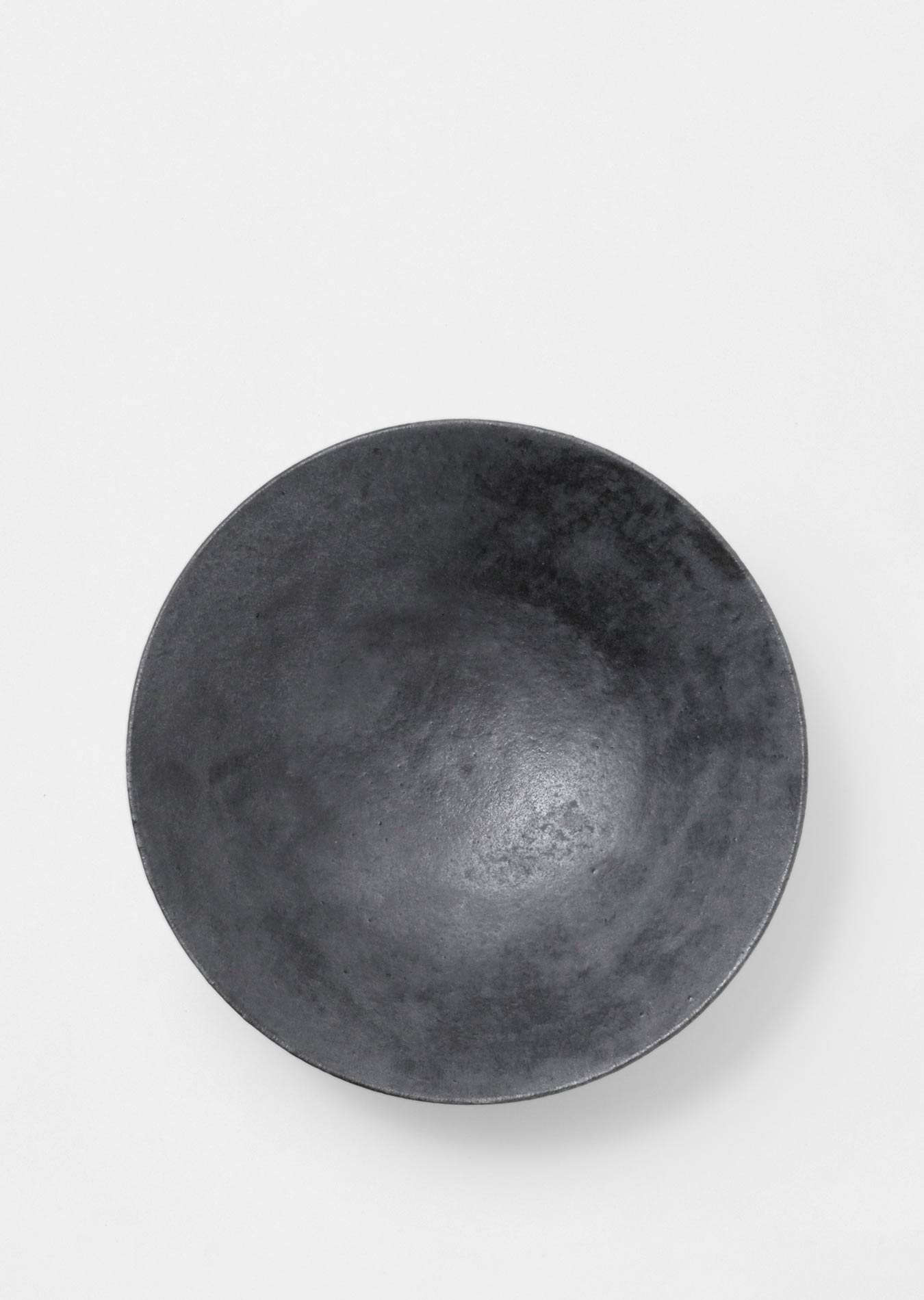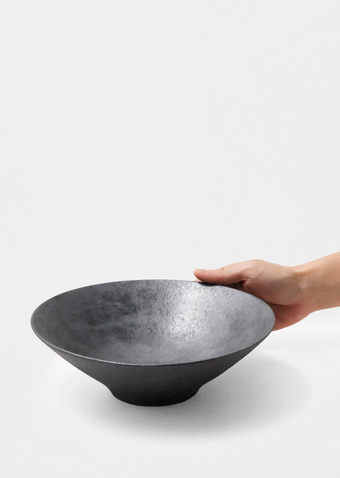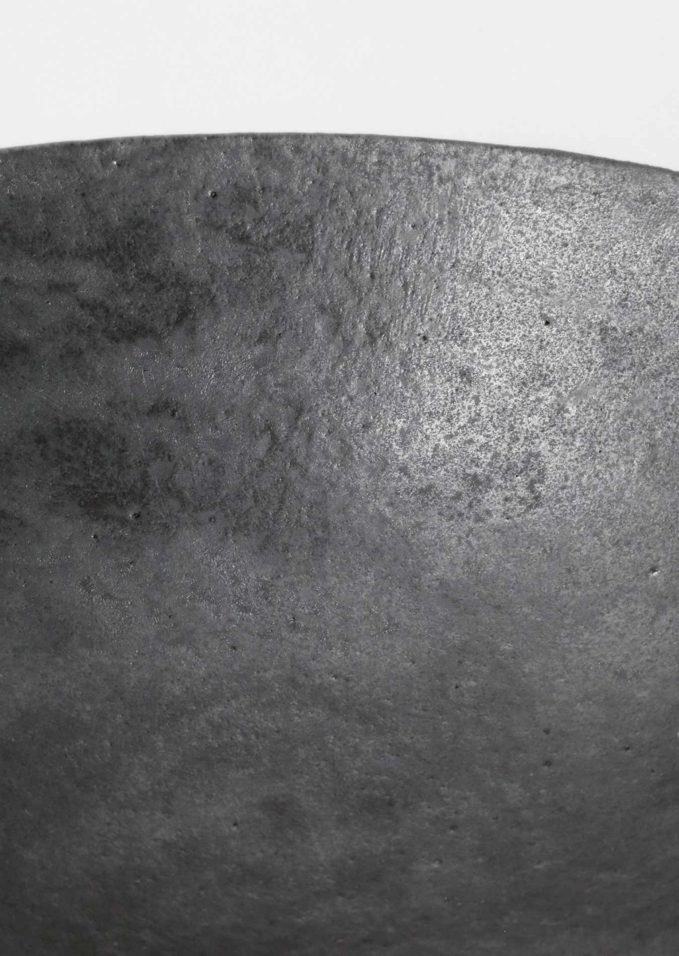 セミマットで金属質の黒色のボウル。黒灰釉は光の角度で黒からグレーまで濃さを変え表情豊、釉薬のムラ感も美しく印象的です。絞られた高台部分から開口部に向けて広がるシャープなフォルムの佇まいに美しさが宿ります。