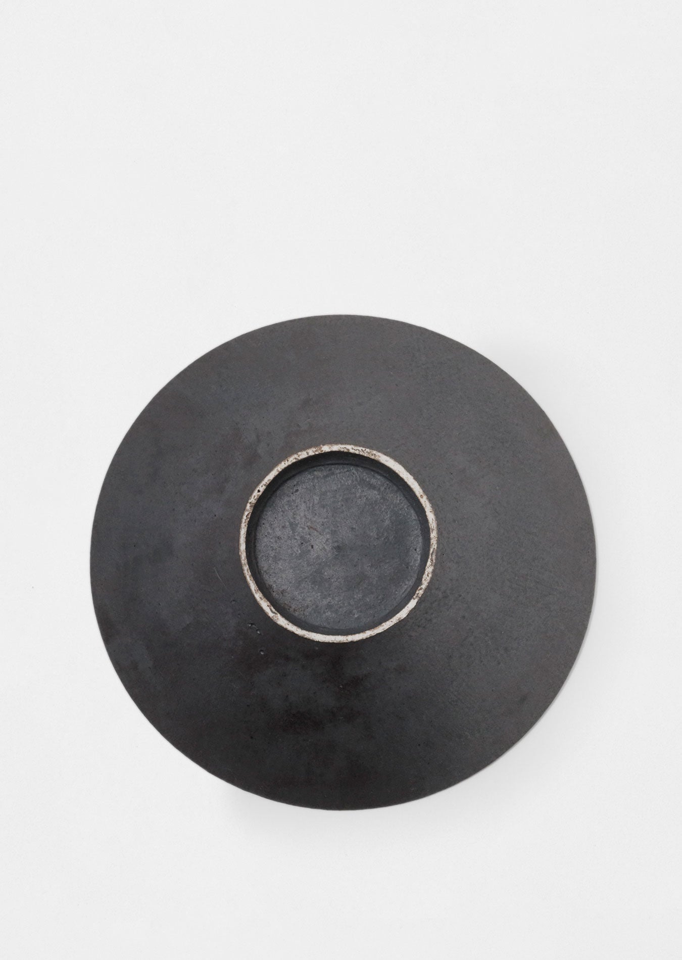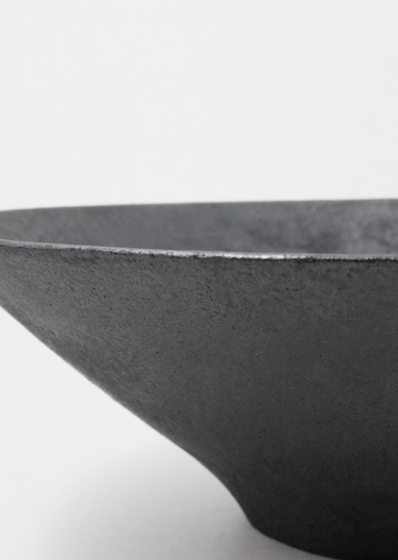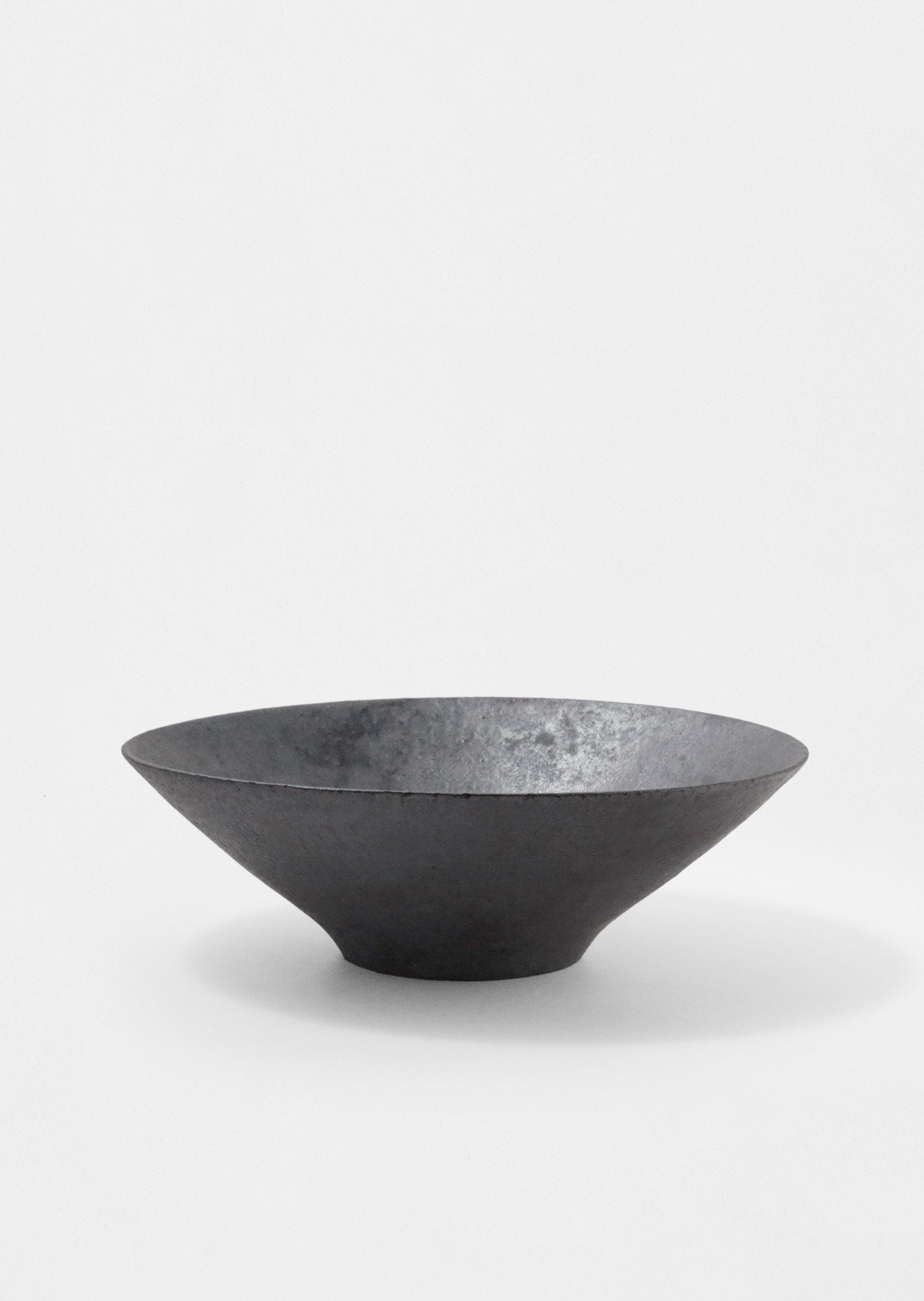 セミマットで金属質の黒色のボウル。黒灰釉は光の角度で黒からグレーまで濃さを変え表情豊、釉薬のムラ感も美しく印象的です。絞られた高台部分から開口部に向けて広がるシャープなフォルムの佇まいに美しさが宿ります。