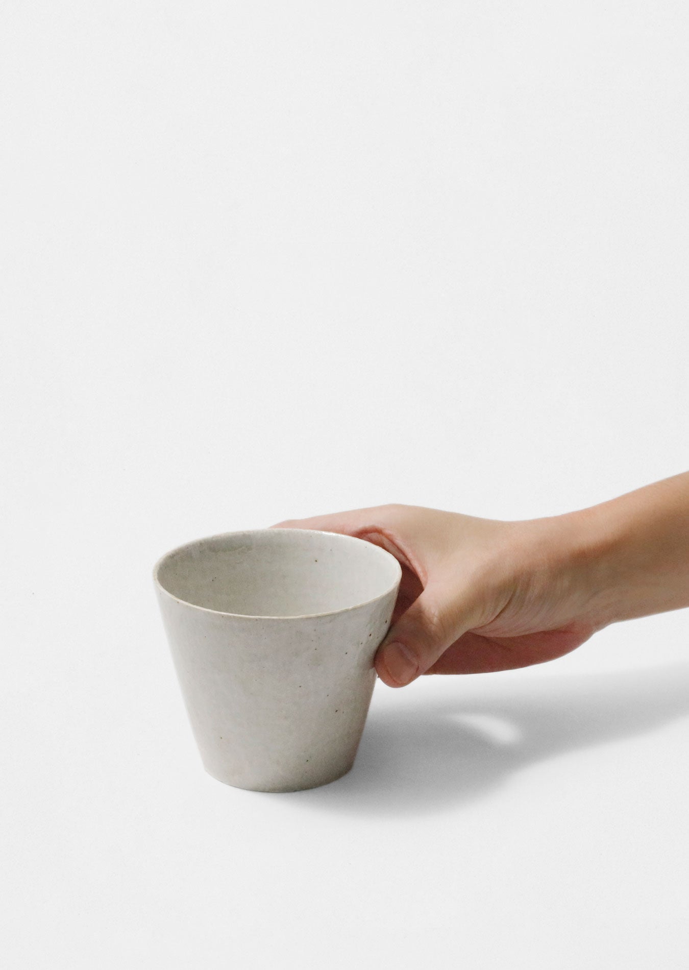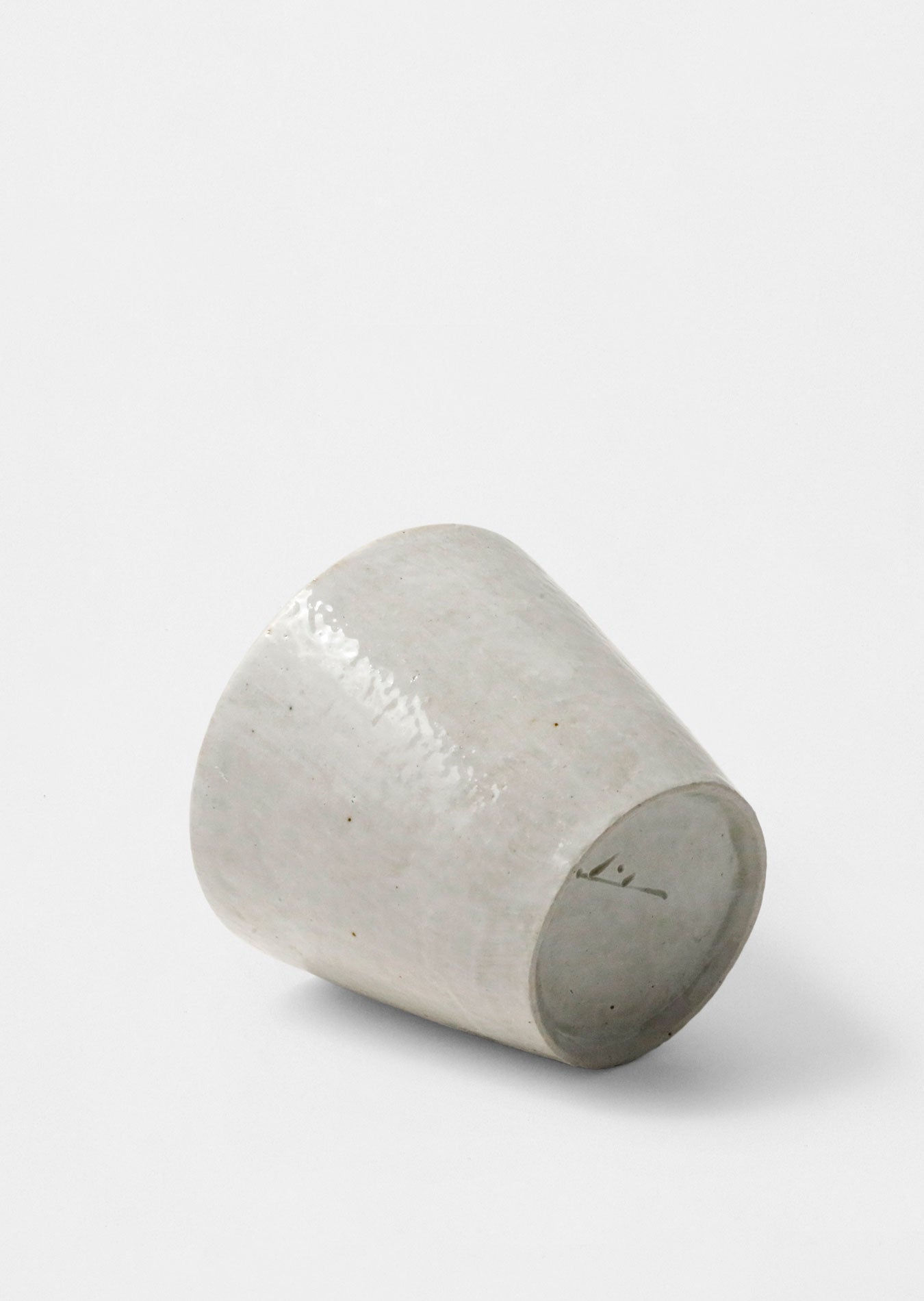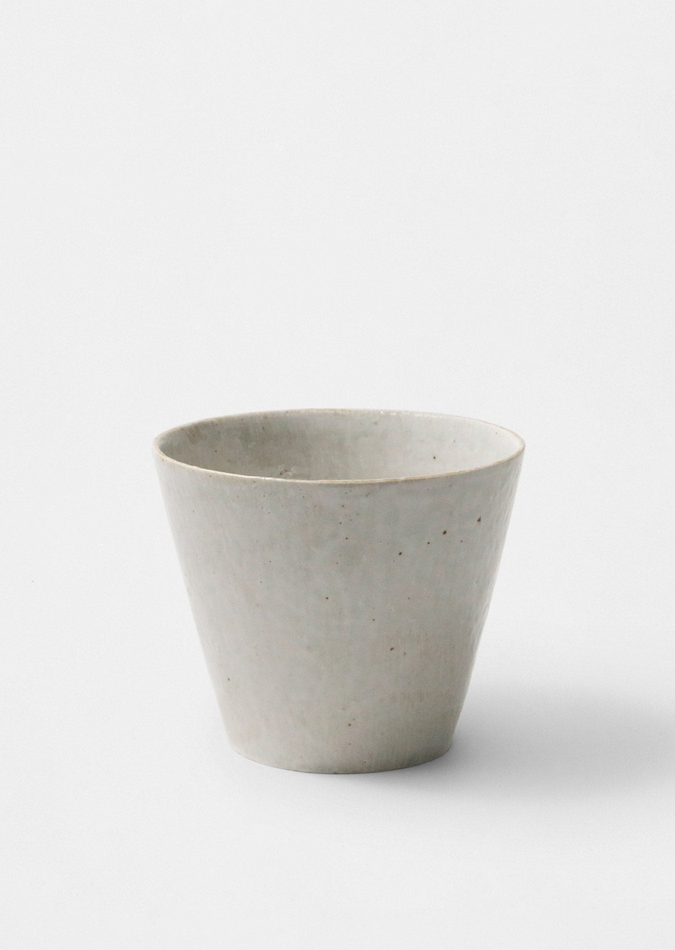 シンプルでシャープなフォルムと釉薬ムラ、エッジの滲みも美しいフリーカップ。全体にツヤがあり、地がほんのり透けた深みのある優しいスモークホワイトです。