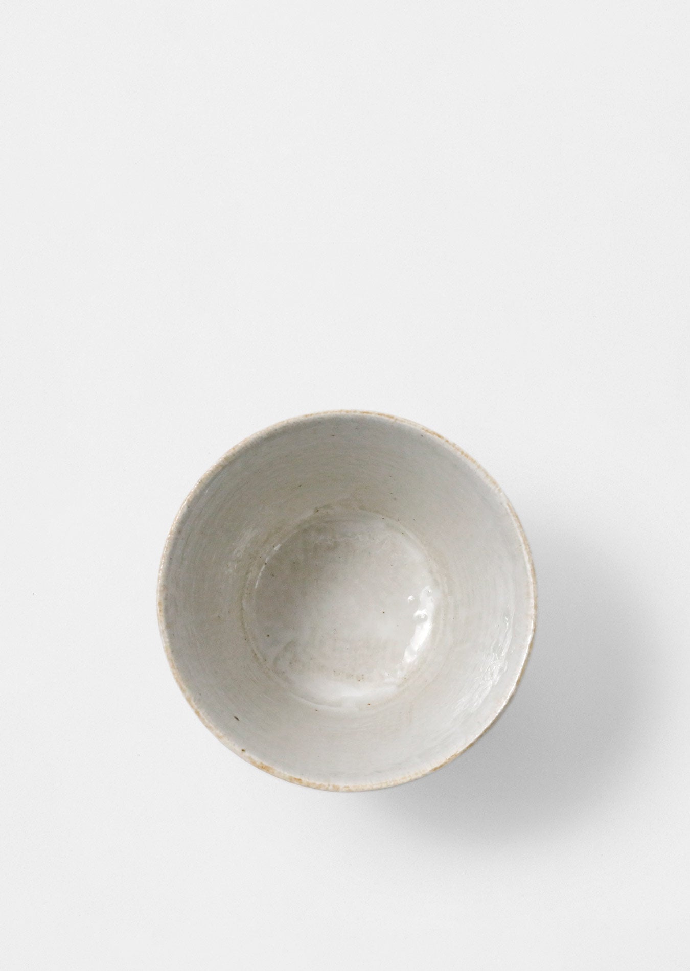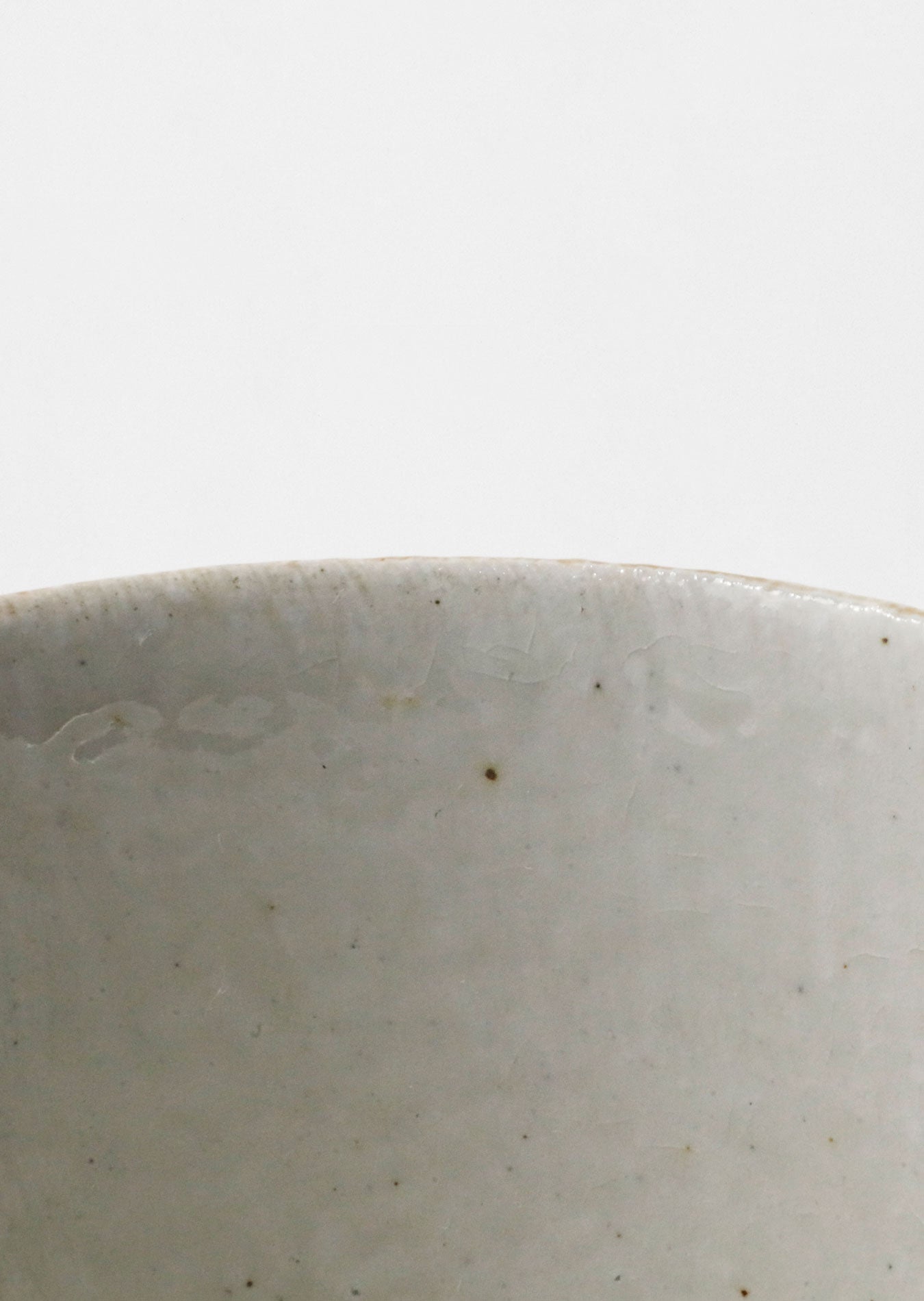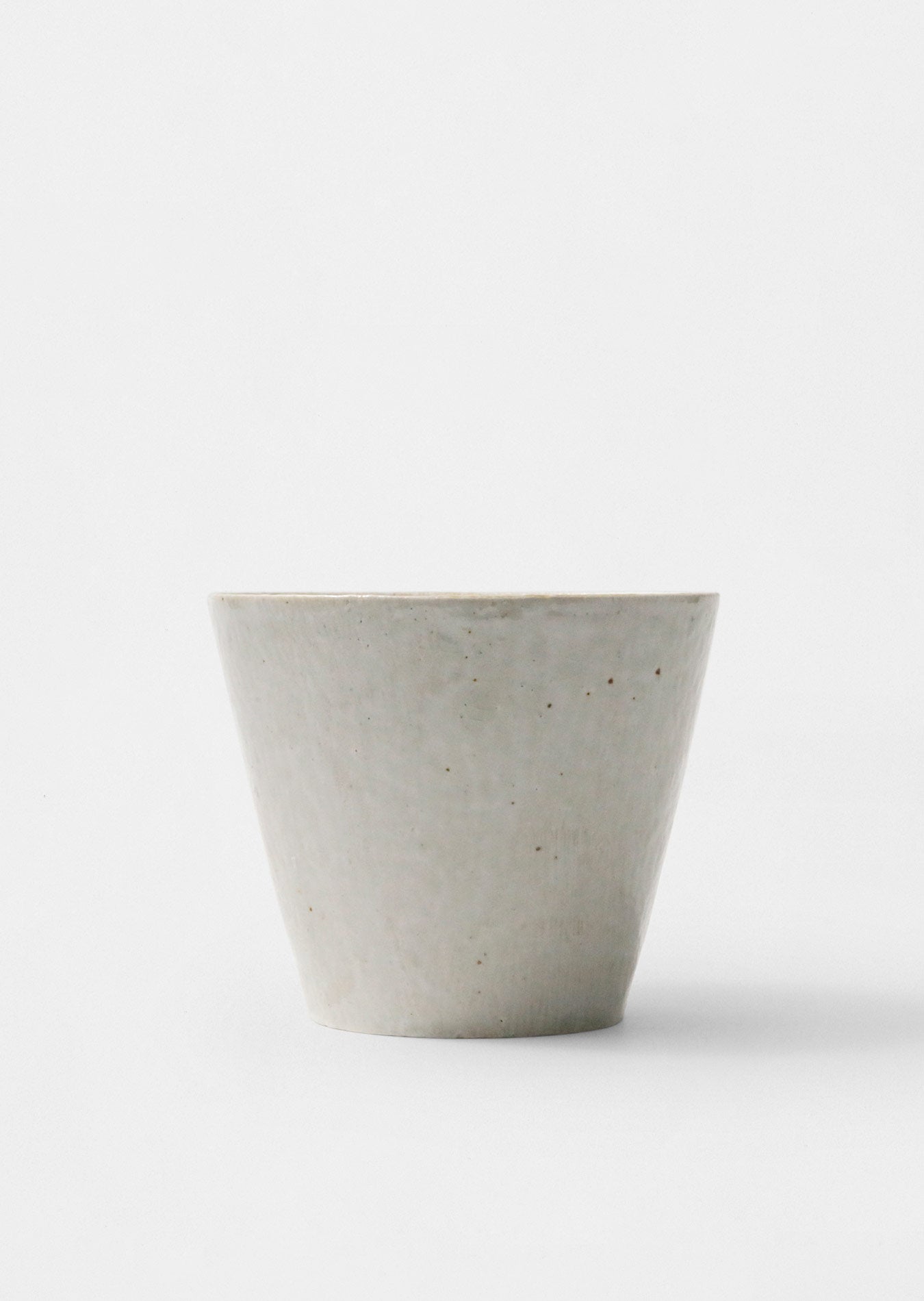 シンプルでシャープなフォルムと釉薬ムラ、エッジの滲みも美しいフリーカップ。全体にツヤがあり、地がほんのり透けた深みのある優しいスモークホワイトです。